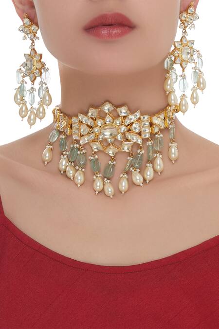Gold Finish, Kundan, Bead, Pearl Drops, Flower Sculpt, Chocker Necklace, Dangler Earrings, Adjustable String Detail, Screw Back Closure