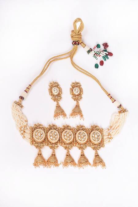 Gold finish choker necklace featuring white kundan polki and pearl embellishments. Paired with matching earrings that have a push back clasp for secure wear.