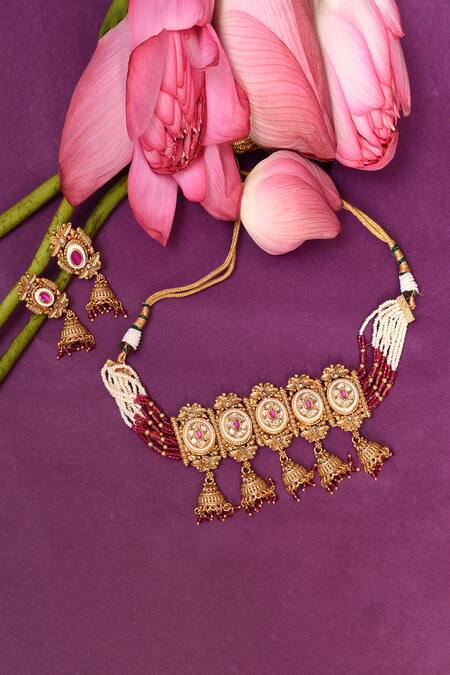 Buy_BelsI'S_Pink Diamonds, Pearls, Stones Embellished Choker Necklace Set_at_Aza_Fashions
