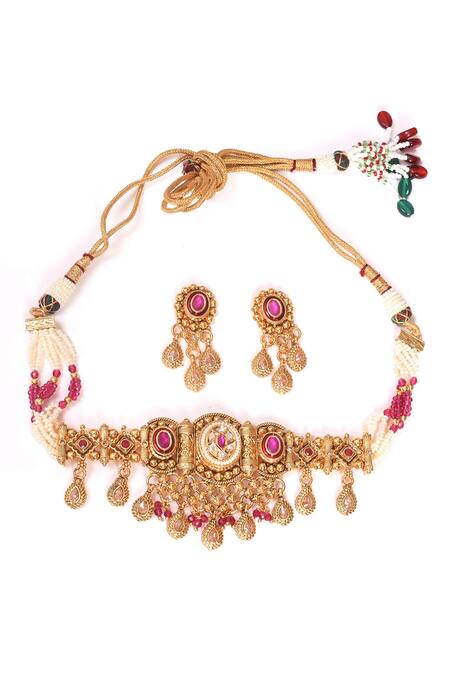 Buy_BelsI'S_Pink Diamonds, Stones Pearls Work Choker Necklace Set_at_Aza_Fashions