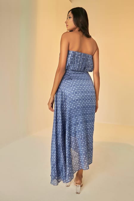 Blue tube dress in chanderi cotton silk featuring hand tie-dye shibori design with ruching on the bust and a draped silhouette