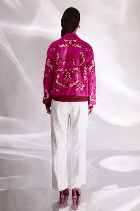 Pink bomber jacket featuring floral hand embroidery and a spread collar
