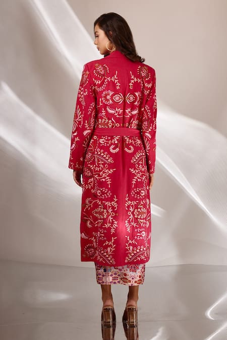 Pink handloom organic cotton long trench jacket featuring floral hand embroidery and side pockets