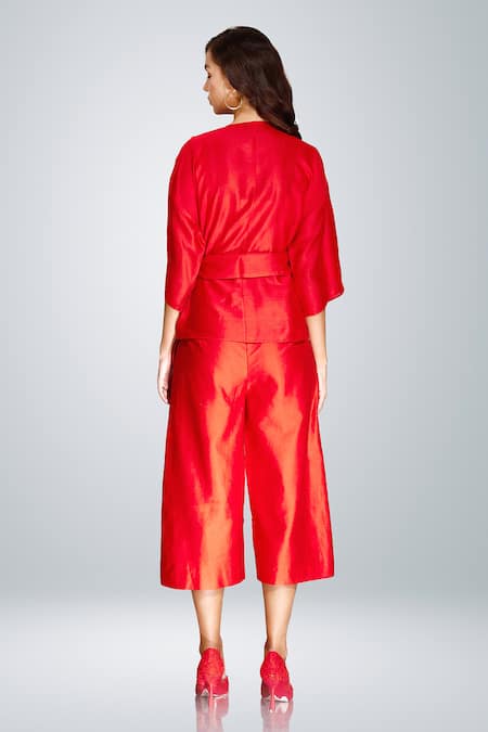 Red chanderi silk high-waisted wide legged culotte featuring a cotton voile lining and a side zip closure