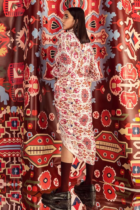 White Handloom Cotton Embroidery Collared Kashan Print Crossover Draped Dress