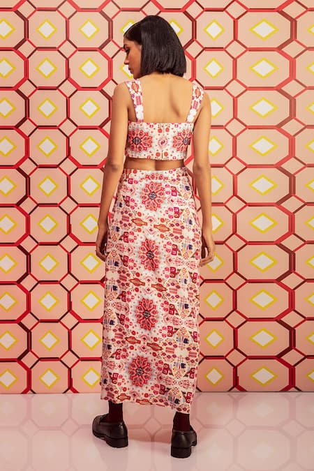 White draped midi skirt made from handloom organic banana silk featuring a Kashan print and a front slit