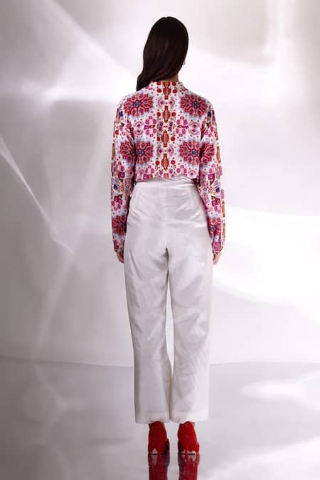 White handloom organic banana silk shirt featuring kashan print with dori work on shoulders