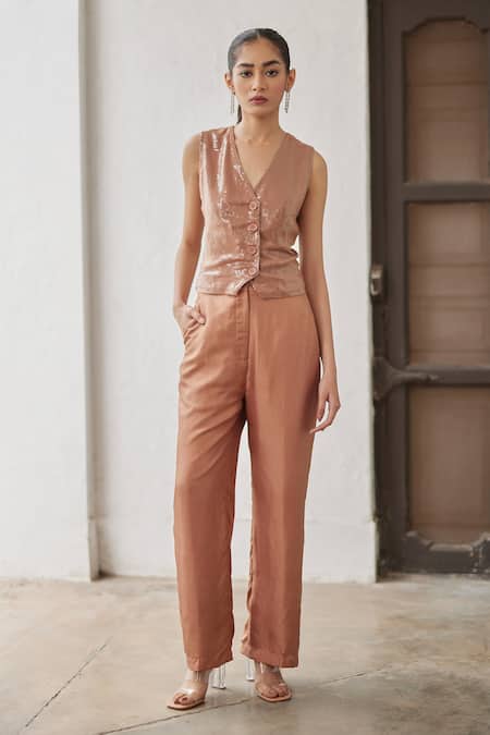 Macchiato brown waistcoat featuring sequin embroidery and button placket detailing