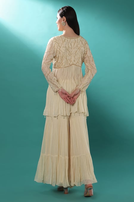 Ivory Georgette, Net Pearls, Stones, Cut Bead Embellished Tunic Sharara Set