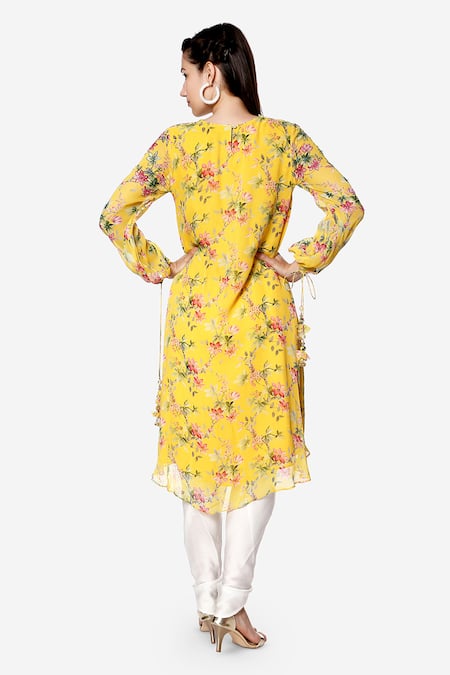 Yellow high-low hem tunic featuring floral prints adorned with cutdana, sequins, and pearls. Paired with soft satin contrast tulip dhoti pant.