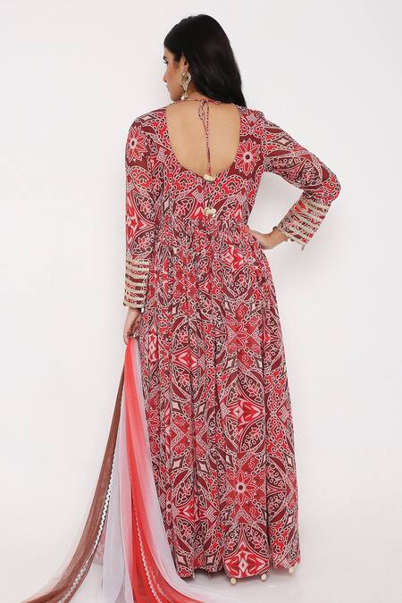 Red anarkali featuring floral bloom print, notched round neckline, and full sleeves. Paired with a matching dupatta and gota embroidered yoke and cuffs.