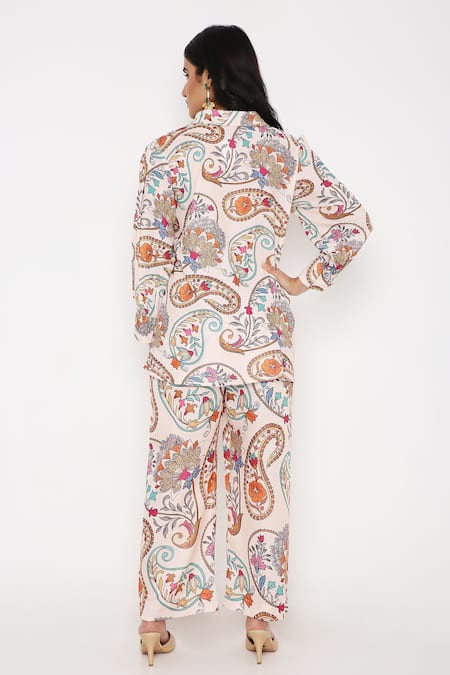 Ivory shirt style tunic featuring an all-over floral bloom print and front tie-up detailing. Paired with coordinating bell bottom pants in a matching design.