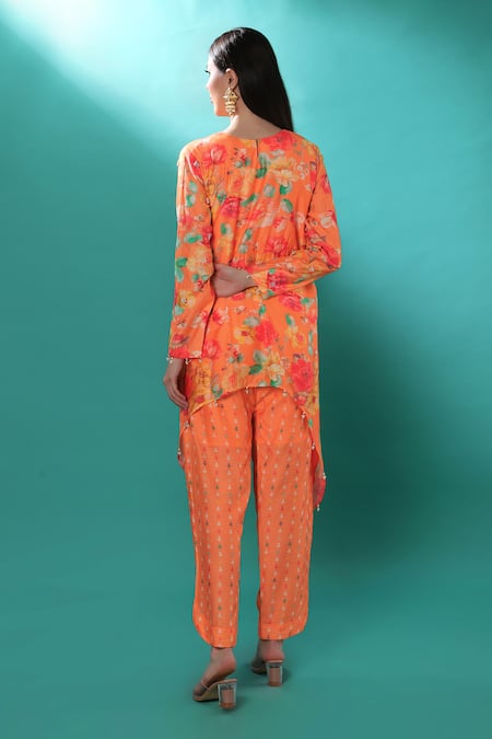 Orange high-low tunic featuring floral print with sequins, pearls, and cutdana embroidery. Paired with matching pants in a relaxed fit.
