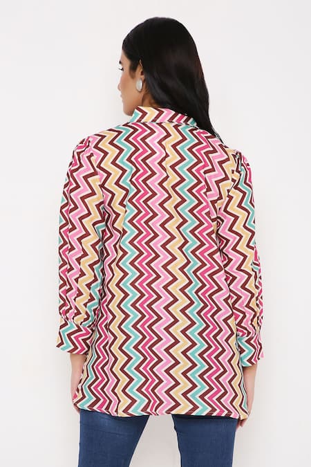 Multi color tunic featuring a collared neck and full sleeves with an all-over chevron print