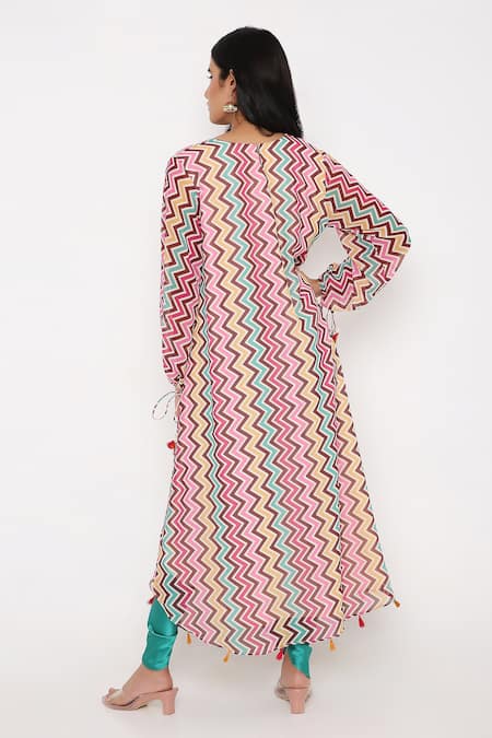 Multicolor asymmetric tunic featuring a chevron print and tie-up detailing on sleeves. Paired with a contrasting dhoti pant in satin fabric.
