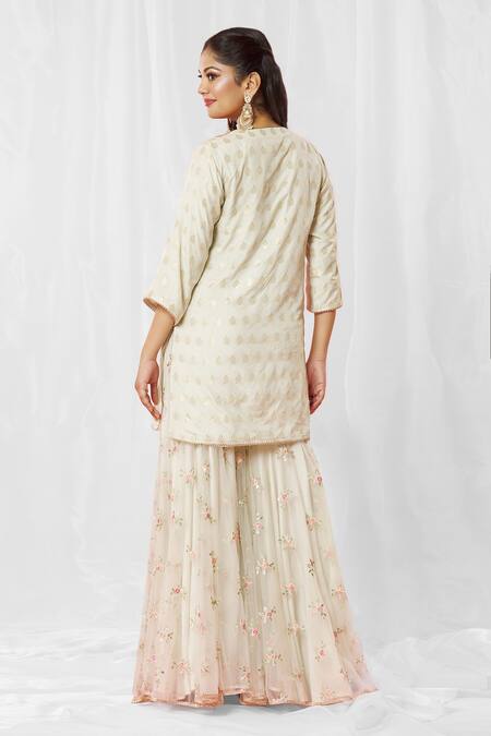 Pista green kurta in chanderi silk featuring embroidered buttis on a floral pattern base. Paired with a floral threadwork sharara and dupatta with gota patti edging.