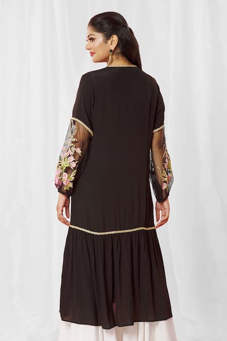 Black Crepe Embroidered Sequin Tie-up Sheer Sleeve Panel Tunic