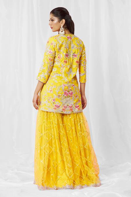 Yellow kurta featuring embroidered floral motifs with resham threadwork and sequin embellishments. Paired with a sequin jaal embroidered sharara and a floral lace edged dupatta.