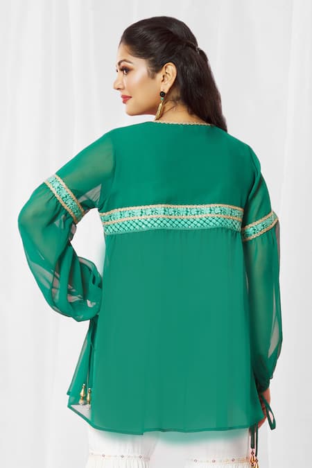 Green top featuring a flowy silhouette with puff sleeves and a round neckline