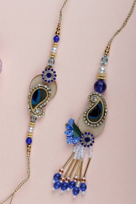 Blue rakhi with paisley motif, zircon embellishment and beads. Comes with lumba rakhi.