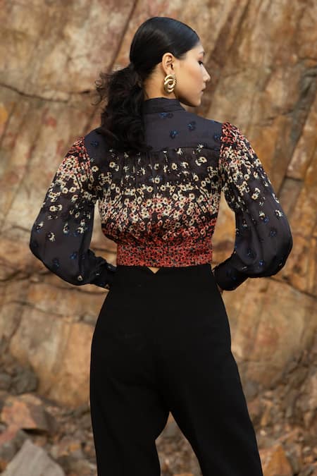 Black ombre blouse with floral print pattern & puffed sleeve.