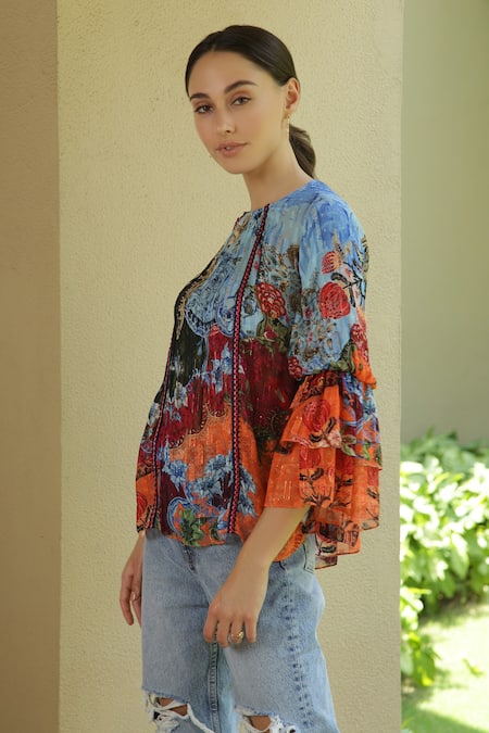 Blue tent top in floral print with tiered bell sleeves and embroidered detail.