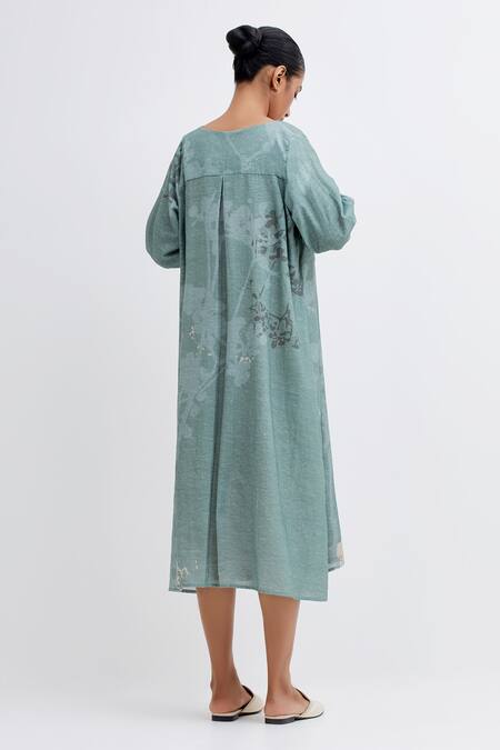 Green Handloom Cotton Applique V-neck Foliage Pattern Jacket With Dress
