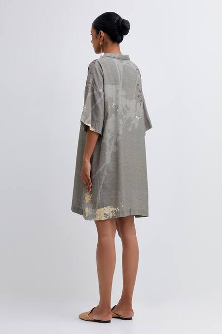 Green Handloom Cotton Embroidery Collared Foliage Pattern Longline Shirt