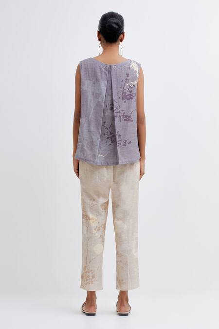 Purple sleeveless top featuring round neckline with placement flower embroidery. Paired with foliage pattern pant with side pockets.