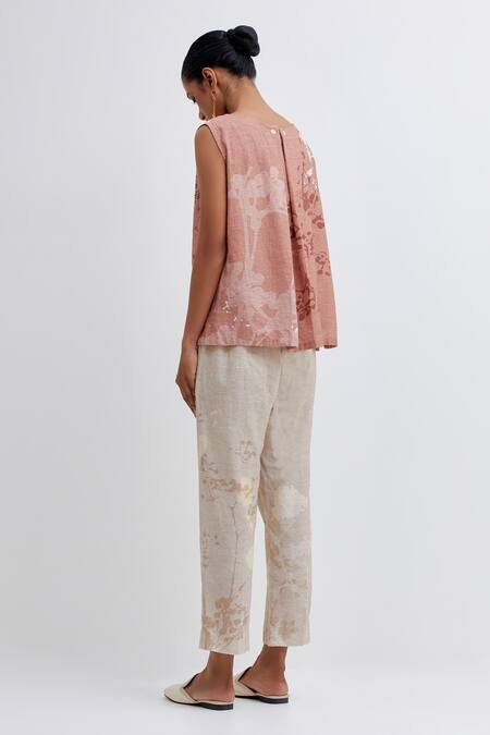 Brown top featuring sleeveless design with placement flower embroidery. Paired with foliage pattern pant that includes side pockets.