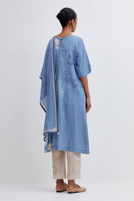 Blue straight kurta featuring foliage patterns and lotus applique motifs. Paired with coordinating pant and stole, the kurta has a box pleated back and a keyhole detail.