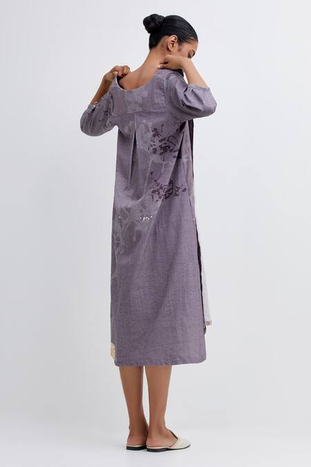 Purple jacket featuring tone on tone foliage patterns with a lapel collar and three-quarter sleeves. Paired with a camisole style inner dress, showcasing lotus applique motifs and a box pleated back.