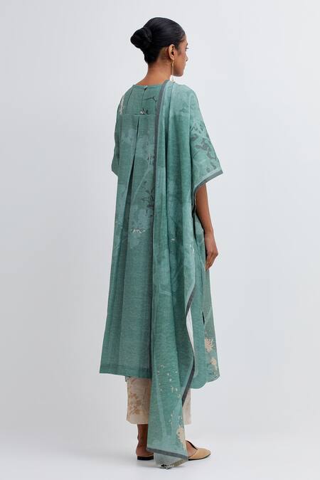 Green kurta featuring tone on tone foliage patterns with a relaxed fit. Paired with matching pant and stole, it showcases lotus applique motifs and a box pleated back.