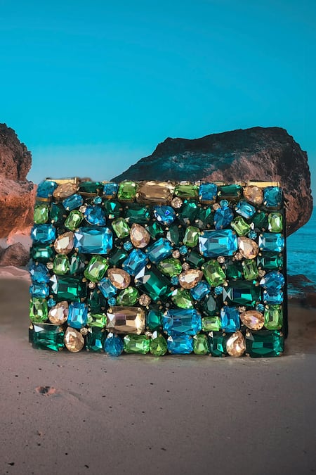 Blue, green & gold clutch featuring all over petal crystal & stone embellishments