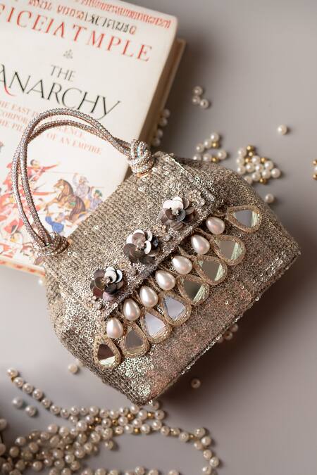 Floral accents with pearl detailing, Chain handle for easy carrying, Intricate sequin embellishments