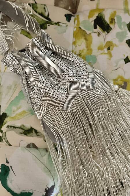 Silver potli bag featuring intricate bead work fringe and sequins detail