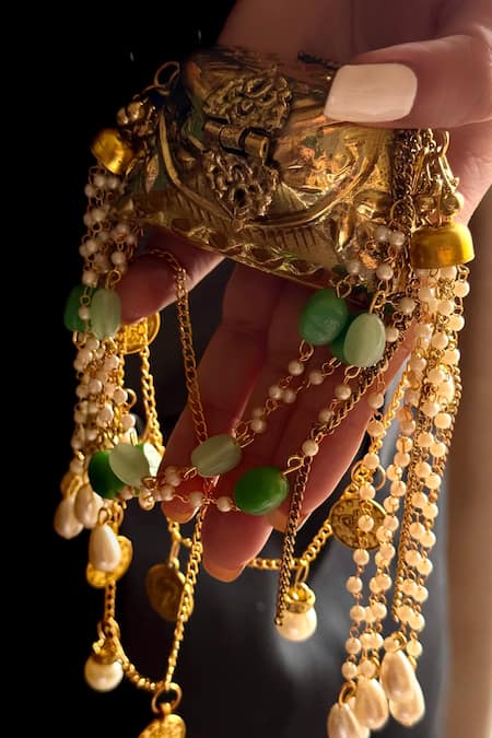 Intricate pearl tassel detailing, Gold chain strap with embellishments