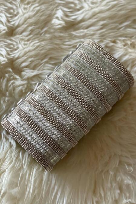Silver flap clutch featuring floral motif kundan work and a beaded back texture