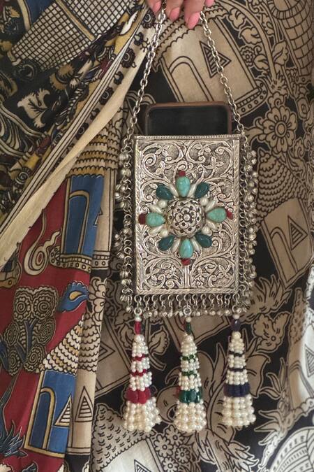 Silver geometric shaped clutch featuring floral carved detailing and stone embellishments. Adorned with tassels for added elegance.