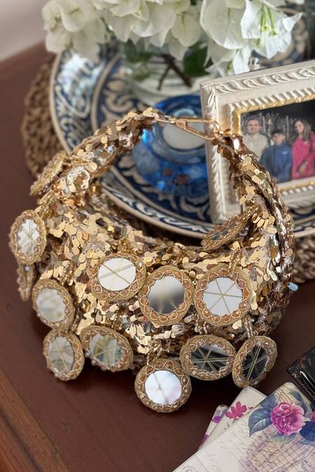Buy_Bhavna Kumar_Gold Mirrors, Sequins Circlet And Embellished Potli Bag_at_Aza_Fashions