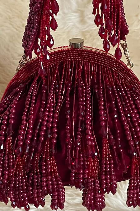 Maroon velvet clutch featuring intricate bead tassels and a metal frame