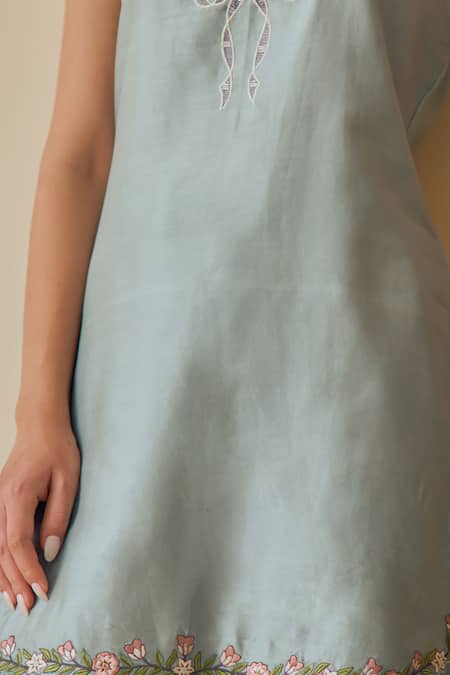 Sky Blue Cotton Silk Chanderi kurta featuring floral embroidery at the neckline and hem, with a mulmul lining. Paired with a matching Cotton Silk Chanderi salwar with floral embroidery and a sheer Pure Organza dupatta.