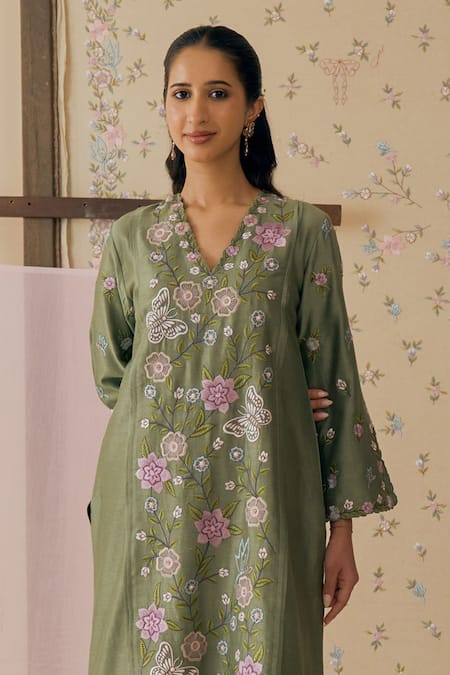 A green cotton silk chanderi kurta features a V-neck, full sleeves, and intricate floral and butterfly embroidery in shades of pink, purple, blue, and white, with a mulmul lining and side slits. It is paired with coordinating green cotton silk chanderi pants with a scalloped hem and a sheer pure organza dupatta.