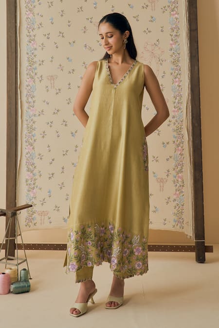 A lime green sleeveless cotton silk chanderi kurta features a V-neckline with floral embroidery and an attached mulmul lining. It is paired with coordinating lime green cotton silk chanderi pants with mulmul lining and extensive floral embroidery along the hem, and a sheer pure organza dupatta.