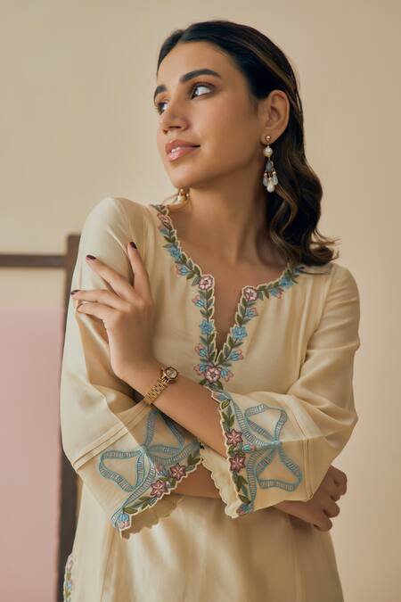 Embroidered V-neckline, Floral embroidery along side slits & pant hem, Scalloped edges on pant hem