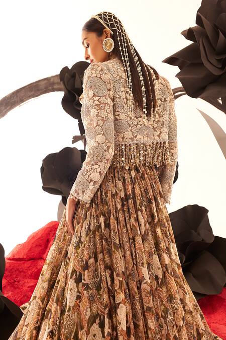 Brown lehenga featuring pleated design with abstract floral print. Paired with a floral print padded blouse and an embroidered jacket with tasseled hem.