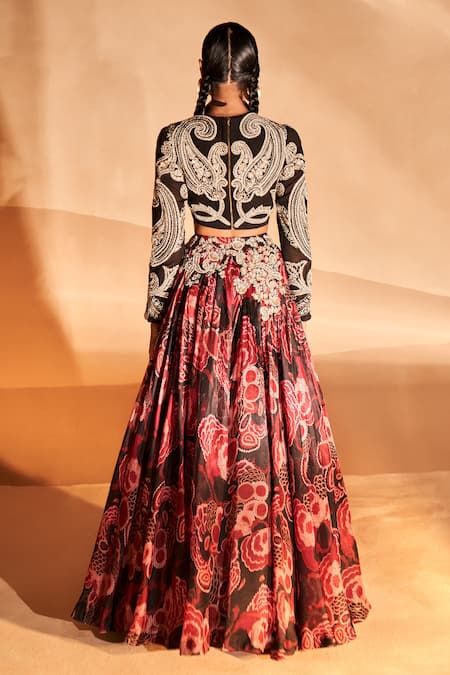 Black padded blouse featuring hand embroidered bold ambi pattern. Paired with a red gulbahar print skirt with can-can and embroidery on the waistband.