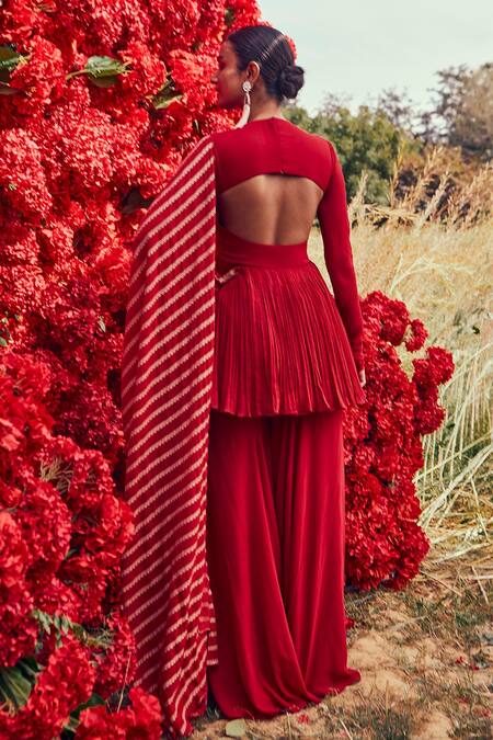 Red peplum style kurta with nejma pattern embroidery and churidar sleeves. Comes with flared pants and nurekha print dupatta.