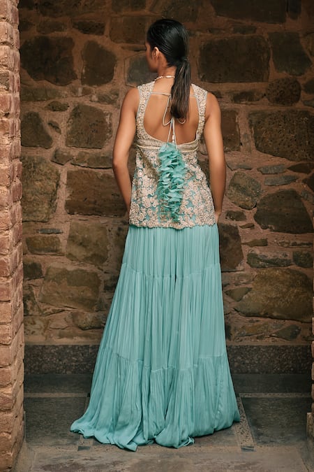 Intricate floral embroidery on kurta, Back dori closure for better fit, Pleated detailing on sharara