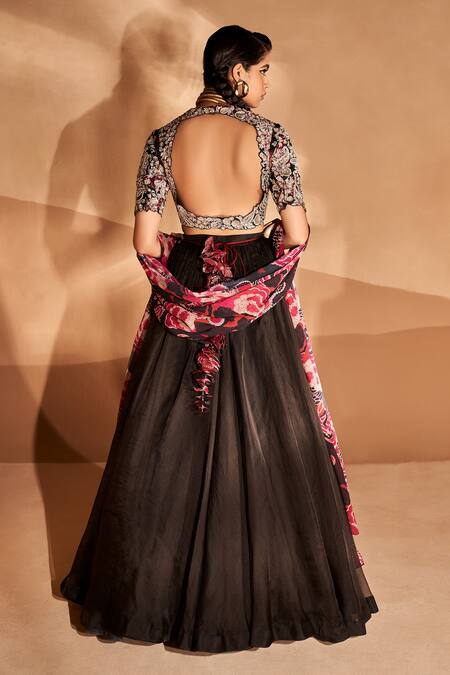 Black Organza, Georgette Embroidery Round Neck Lehenga Set With Blouse